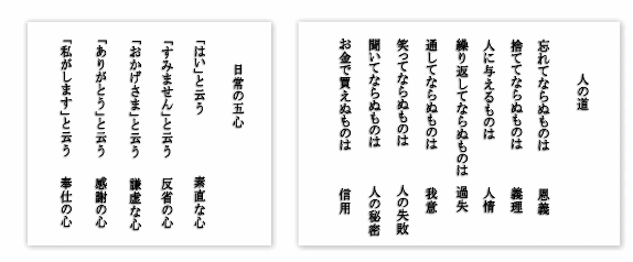 この2つは、日々、あたしの頭にある言葉なの。両方とも学生の頃、年配の先生が教えてくれた。当時は 何かあるたび、それらを出されてはお説教(笑)五心は中学の家庭科のおばぁちゃん先生からのもの よく家庭科の授業とかって、先生がお手本を前で見せてくれるやない?前に皆、集まって、先生囲んだり なんかして見てたりって多々あったでしょう?でも、友達と見えないとこでこっそり違う話ししてたり 窓から見える校庭に好きな先輩とか体育やってたりなんてしたら、それどこじゃないゆうの?(爆) で、いざやろうとする時は周りみながらとか、たまに見てなかったのがばれたりして先生のお説教が 始まるわけ、この頃って、生意気とゆうかある意味、大人なんか何さ、ふん!みたいな?感覚があった でしょ?(って、あったよね? 爆)「もう〜いいじゃ〜ん」とか「だって〜」とか、言い訳がましい ゆうの?(笑)屁理屈ばっかこねちゃうわけ。そうすると「はい と云う素直な心 言いなさい ほれ!」 って先生がゆうのよ〜当時、壁に五心が掲げてあって、その前に友人と立たされて、ほらって(笑) 「え〜〜やだ〜そんなのゆうの〜ねぇ?」とか、友達と、その場から逃げちゃったり(笑)でもその先生 どこまでも追っかけて来るのよぉ。「えーーじゃないの〜!こら、言いなさい、あんたっち!」って トミさんゆう先生で「トミさんには、ほんとまいるよね〜」とか、皆で言ってたわけ(おいおい・・)今は まいってたのは、先生の方だっつーの。ってわかるけど(爆)でもね他の先生よりも、温かいゆうの かなぁ信頼出来て、よく怒られたけど先生のお説教は、生意気な口叩きながらも、ちゃんと聞けたの。 今でも、先生の言葉、日々頭にあるもの。響いたって感じかなぁ。もう1つは、人の道とか仙人訓とも 云うみたい。これも美容学校時代おばぁちゃん先生の言葉。あたしが通った某有名美容学校は先生が 九割、年配なのね?美容学校ゆうても、物理、生理解剖、皮膚化学、伝染病、消毒法などなど・・・授業 があるわけ、内容も専門的で固いのね?法規も多いし。そんな授業、70近い年配の先生が行なうの。 話しも、眠くなっちゃうゆうの?(爆)半日、実習、半日、授業ってみっちりだったし、それで ふへ〜 なのに、先生が年配って事もあって、やたら厳しいの。生活態度とか、身なりとか、言葉とか、ヘトヘト ヘナヘナ(笑)まして先生達は(皆 免許持ち)髪結い時代、戦後美容業界を大きくして来た人達やから プライドがやっぱ凄いのよ、お化粧なんてしないで学校来る子とかに「まゆげ くらい書いてきなさい!」 ロッドとか、うまく巻けずぐちゃぐちゃなっちゃうと「うじゃうじゃ毛虫じゃないのよ〜!」とか(笑) もうね、屁理屈なんてこねたら100倍で返って来た(爆)そんな担任の先生も教室にこれ貼ってたの 学生の頃、たくさんの先生と触れ合う事ってあったけど、やっぱ印象に残ってる先生って、一部だし。 今でも、ふとあんな事あったなぁ、とか、あんな事言われたっけなぁ、とか思い出すの。時代は変わっても 基本的な教えは一緒だって思うし、息子にもいつか教えてあげたいな。と(笑)見た感じ、古いなぁ・・・ って感覚が無くはないけど、でも納得させられる。今でも、ちゃんと心に響く言葉。今までも心打たれた 言葉や、ズサッ・・・っと、やられちゃったなぁんて言葉は、たくさんあるけど、その都度、我が身を振り 返っては反省し学べる柔軟さ、これからも持っていたいなんて思うわ。だって大人になっていくにつれて、 柔軟さってかけるってゆうでしょ?悪く言ったら、頭カチカチになるってゆうの?(笑)それだけ、人生 歩み重ねて経験した結果なんだろうけどねぇ。自分より年齢が上の人だから、ゆう事が全て正しい事とも 言いきれないし、自分が正しい思い過ぎる結果、自分の否に気づかなかったり、気づいたとしても今更、 認める事すら出来ないなんて人もいるでしょう。逆に幼い子供がゆう事の方が正しいなんて事もあったり するし、人間なんて、ぬるま湯に浸かってしまえば嫌でもぬるま湯に自然と慣れていくわけで己の柔軟さ 保つためにも、自分で反省するためにも、時々この言葉に目を通して渇を入れるの。そうすると我が身 振り返れるし。先生って凄いなぁって、今更ながらに感じるわぁ。今になって心から先生へ感謝が出来る ようになったわぁ・・・どこで何してるのかなぁ。そんな事、思うと、息子にも良い先生との出会い ありますように〜って、母は心から願うわぁ でも先生には苦労かけちゃったなぁ・・・くっ・・・反省・・・先生に、今なら素直に言えるのになぁ・・・「先生、ごめんなさい」って(笑) |